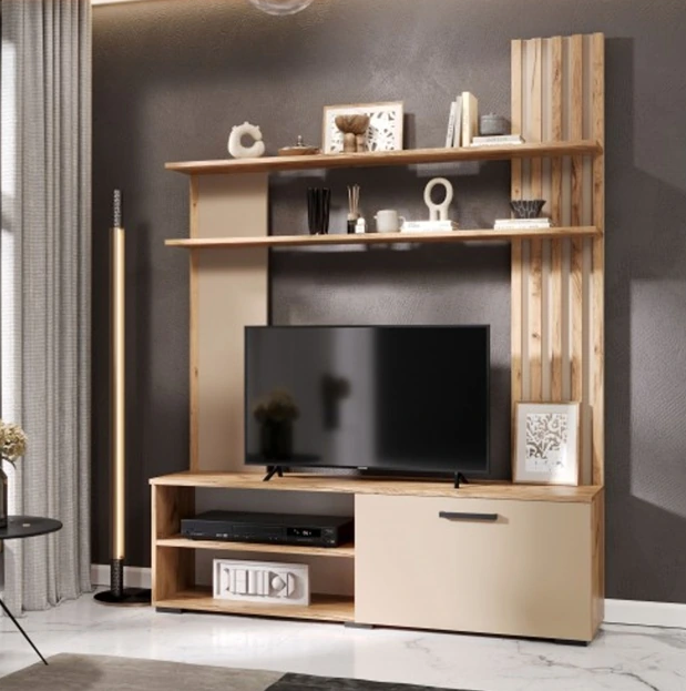 Комбинация цветов «Дуб Вотан» и «Кашемир» создает легкий гармоничный контраст. Задняя часть стенки украшена декоративными рейками, что добавляет интерьеру фактурности и динамики.
