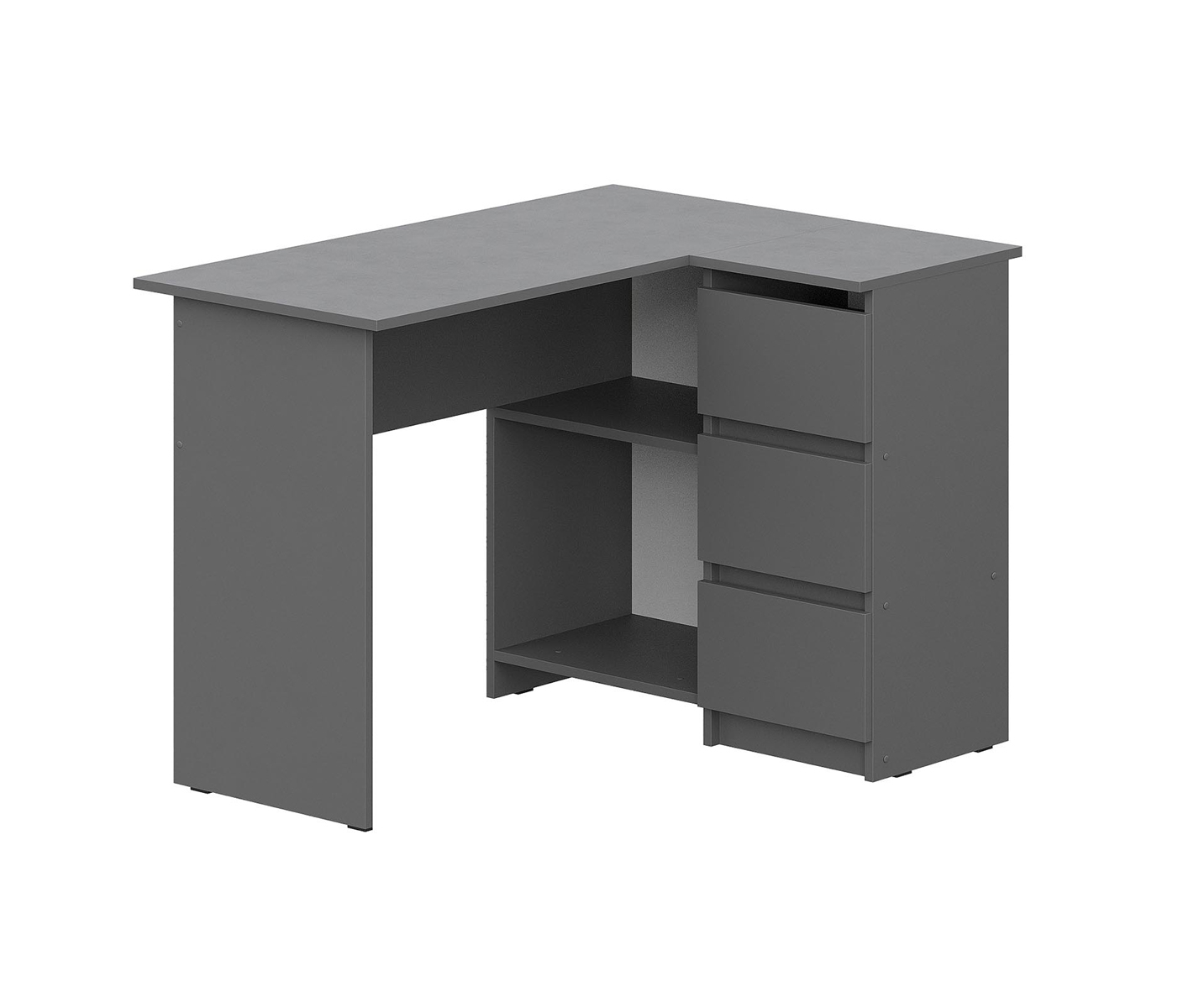 Стол изготовлен из высококачественного ЛДСП в цвете «Графит серый» и выполнен в минималистичном стиле, поэтому ящики не имеют ручек и открываются за выступающие торцы фасадов.