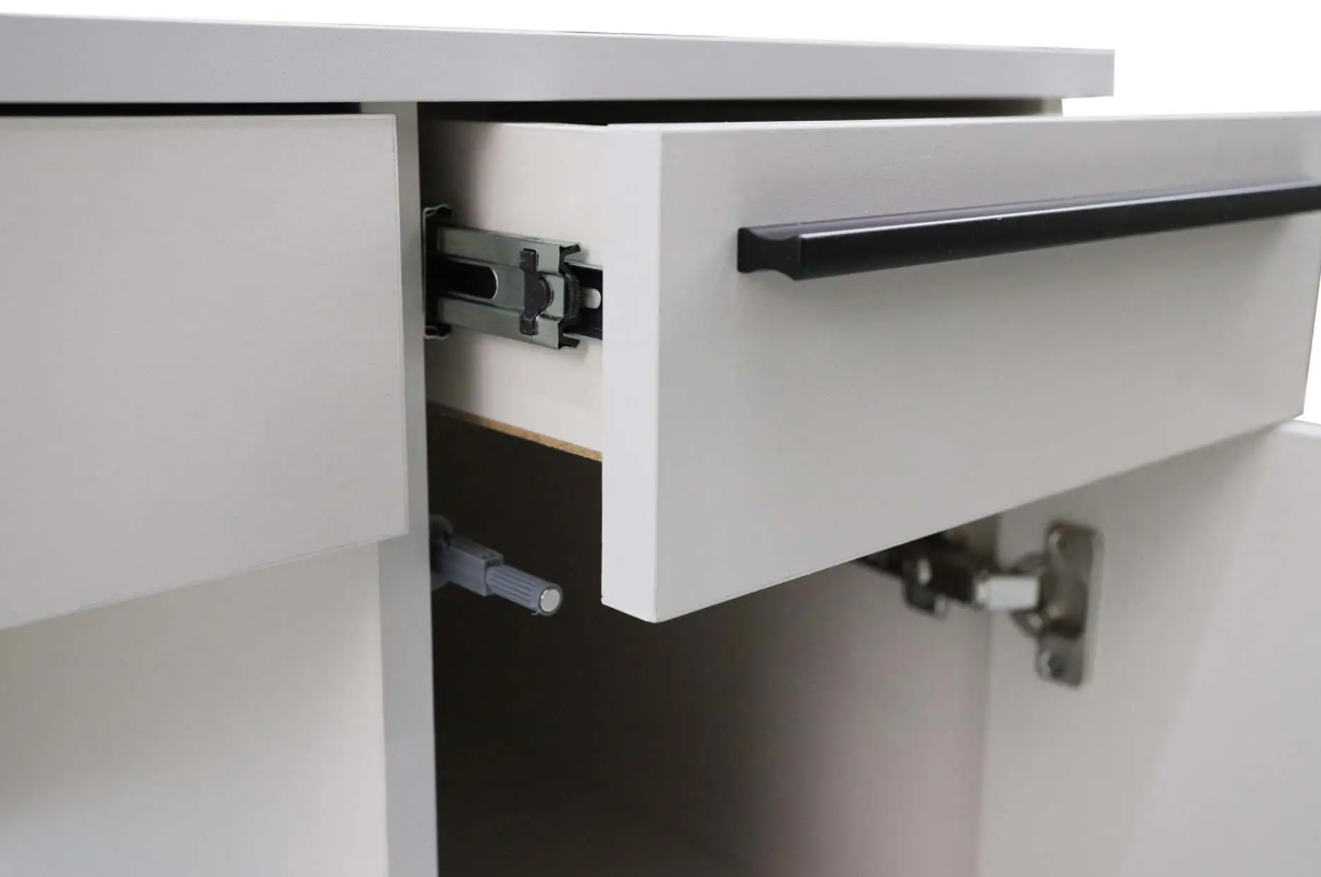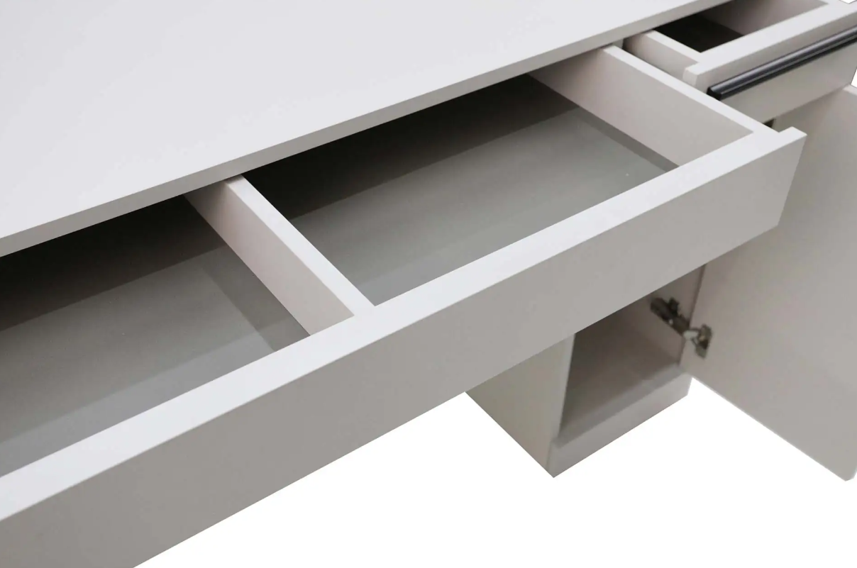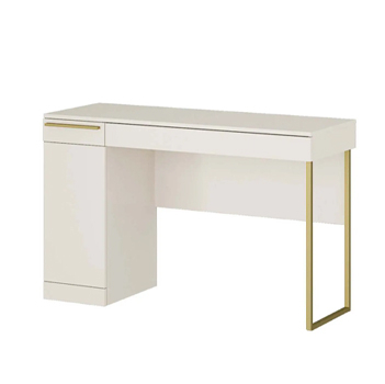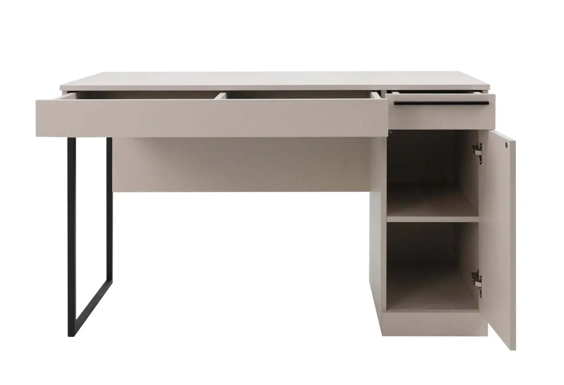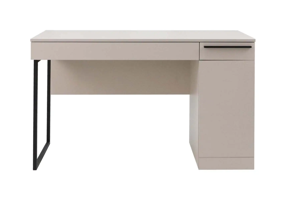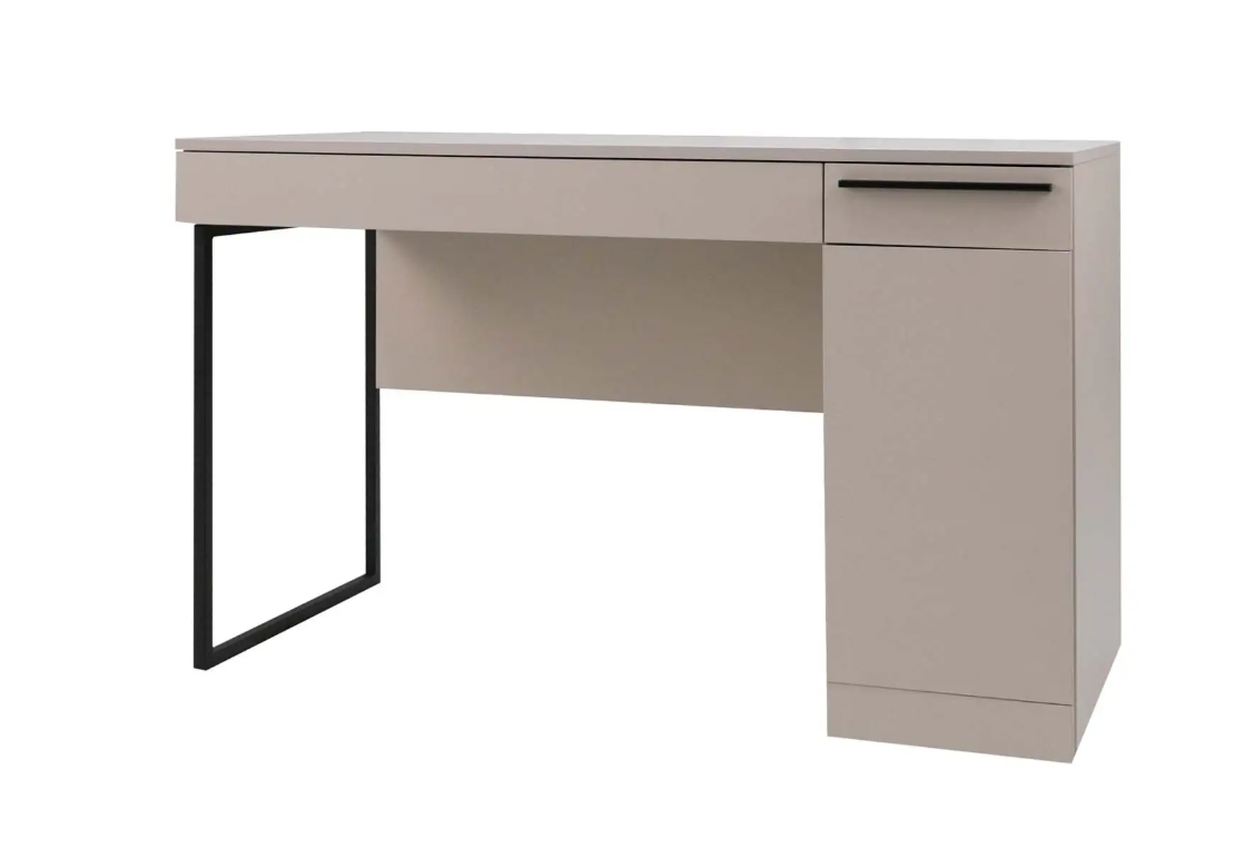 Стол письменный выполнен в популярном цвете кашемир. В тумбе установлен выдвижной ящик и полки для хранения. Имеется возможность выбора стильной металлической опоры и ручки для ящика в цвете сатиновое золото или в лаконичном черном цвете.