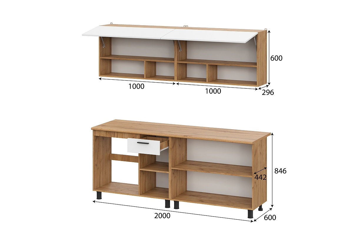 Верхние шкафы можно устанавливать как сверху открытыми нишами, так и снизу, модуль переворачивается.