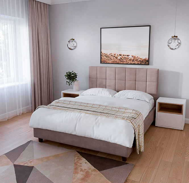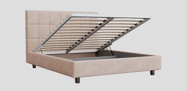 Кровать имеет подъемное ортопедическое основание и короб с дном из МДФ.