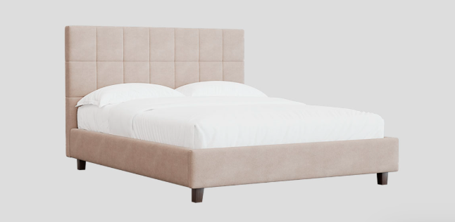 Интерьерная кровать с мягкой обивкой и высоким изголовьем.