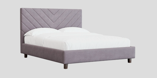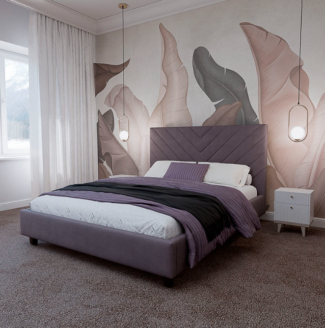 Интерьерная кровать с мягкой обивкой и высоким изголовьем.