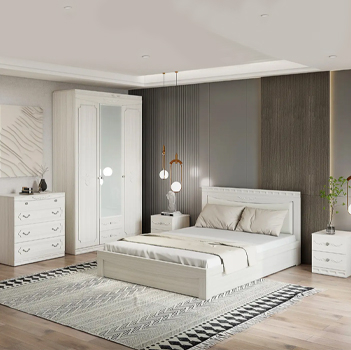 Кровать с мягким изголовьем, вместительные шкафы, комод и тумба — всё выполнено в едином дизайне. Вы можете собрать идеальную конфигурацию под планировку вашей спальни, дополнив гарнитур нужными модулями.