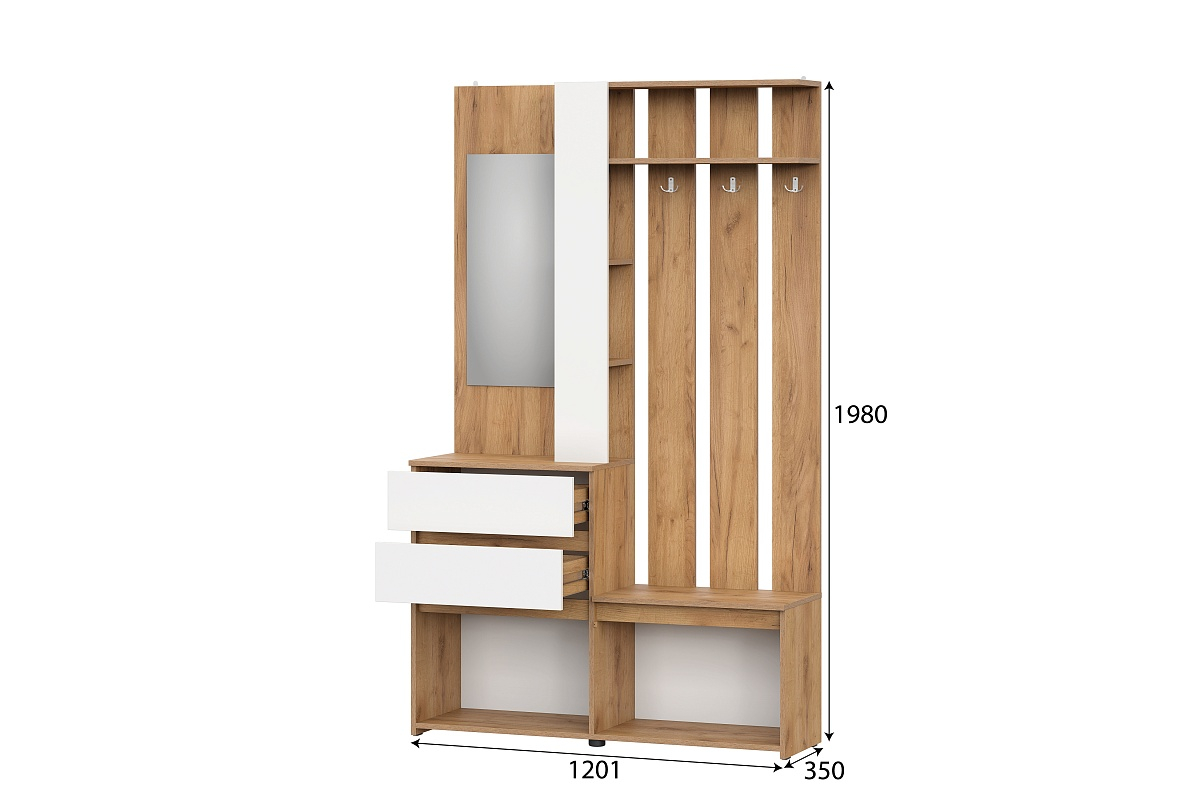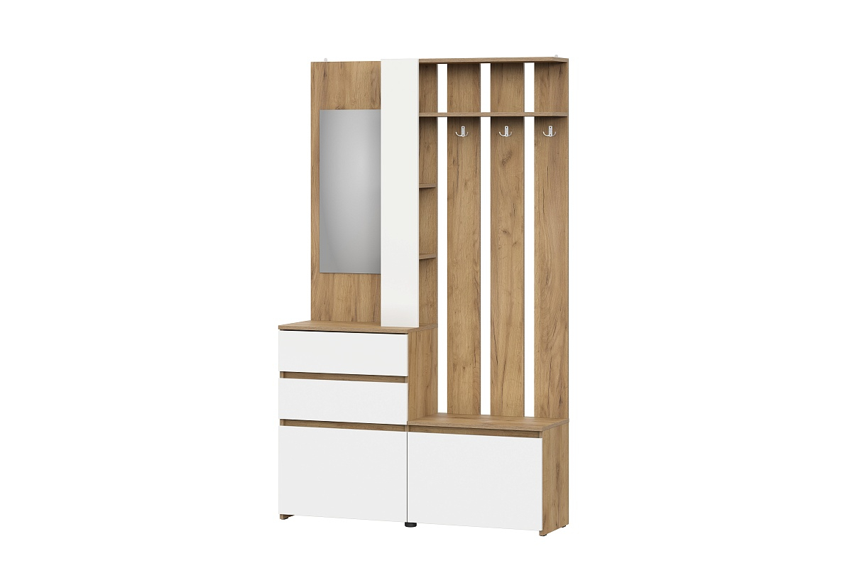 Модульная вешалка из серии «Некст 1» оформлена в элегантном контрасте: теплый золотой дуб корпуса и свежий белый цвет фасадов.