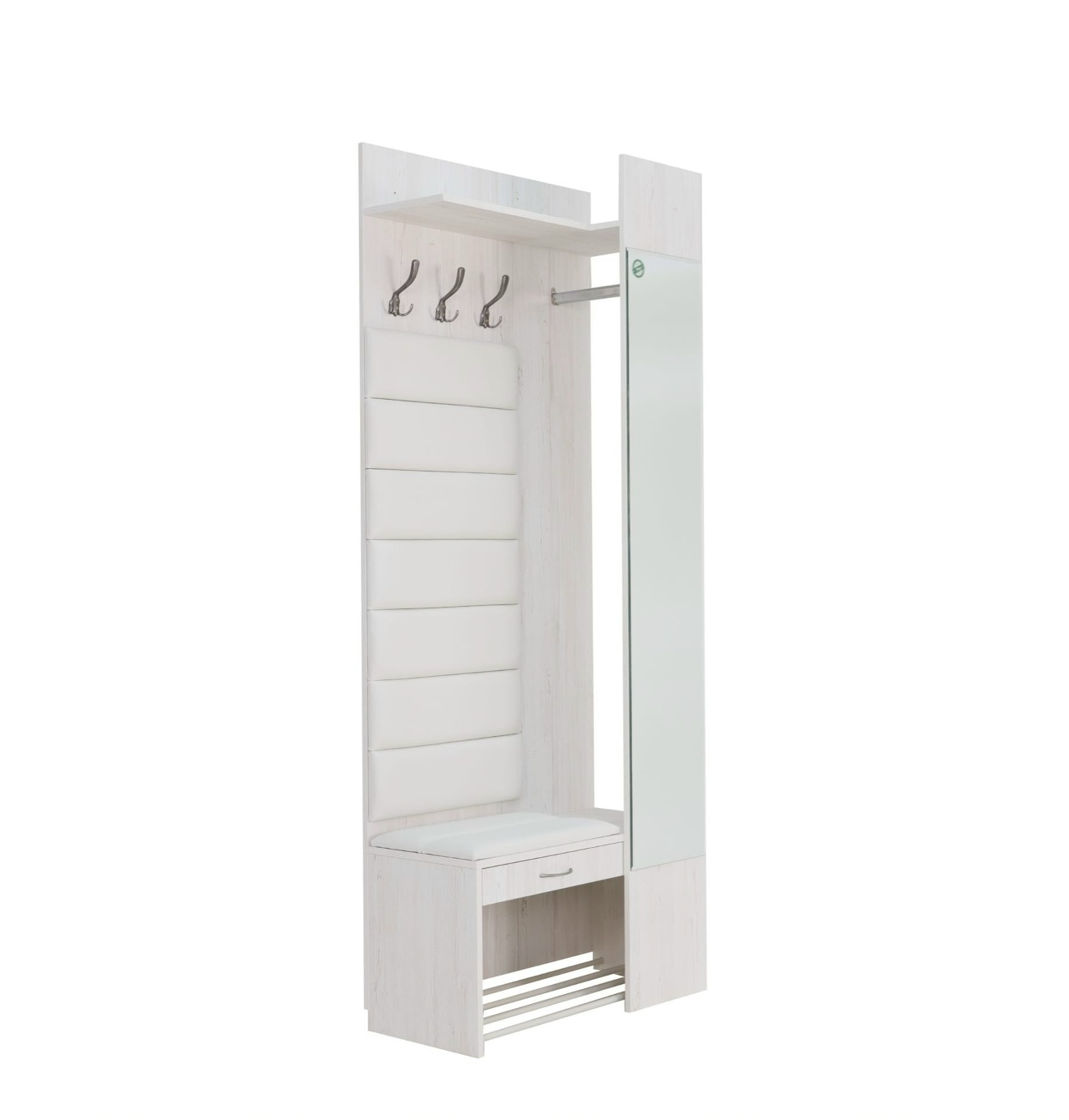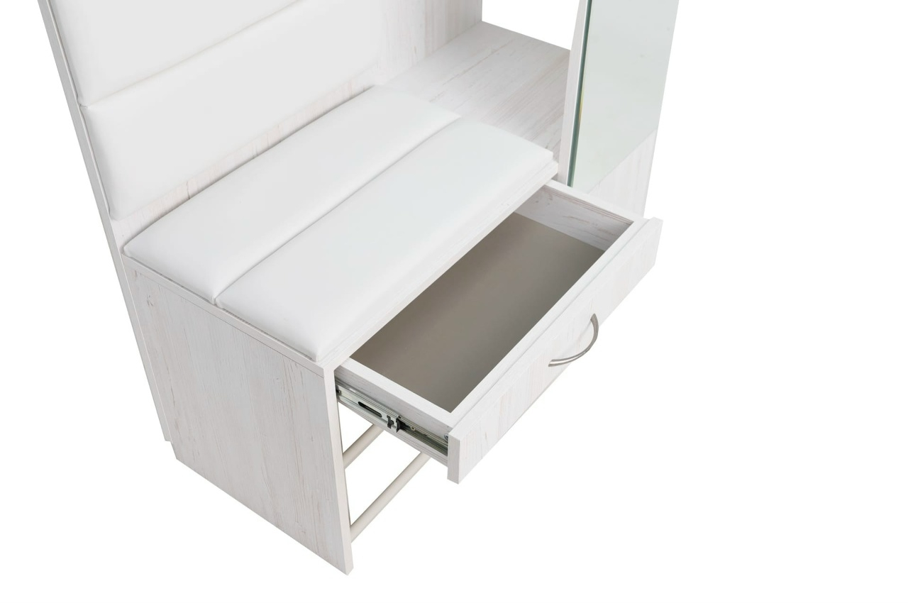 Прихожая Ольга Милк включает в себя элегантное зеркало с фацетом, практичную обувницу и мягкие элементы для создания идеального пространства вашей прихожей.