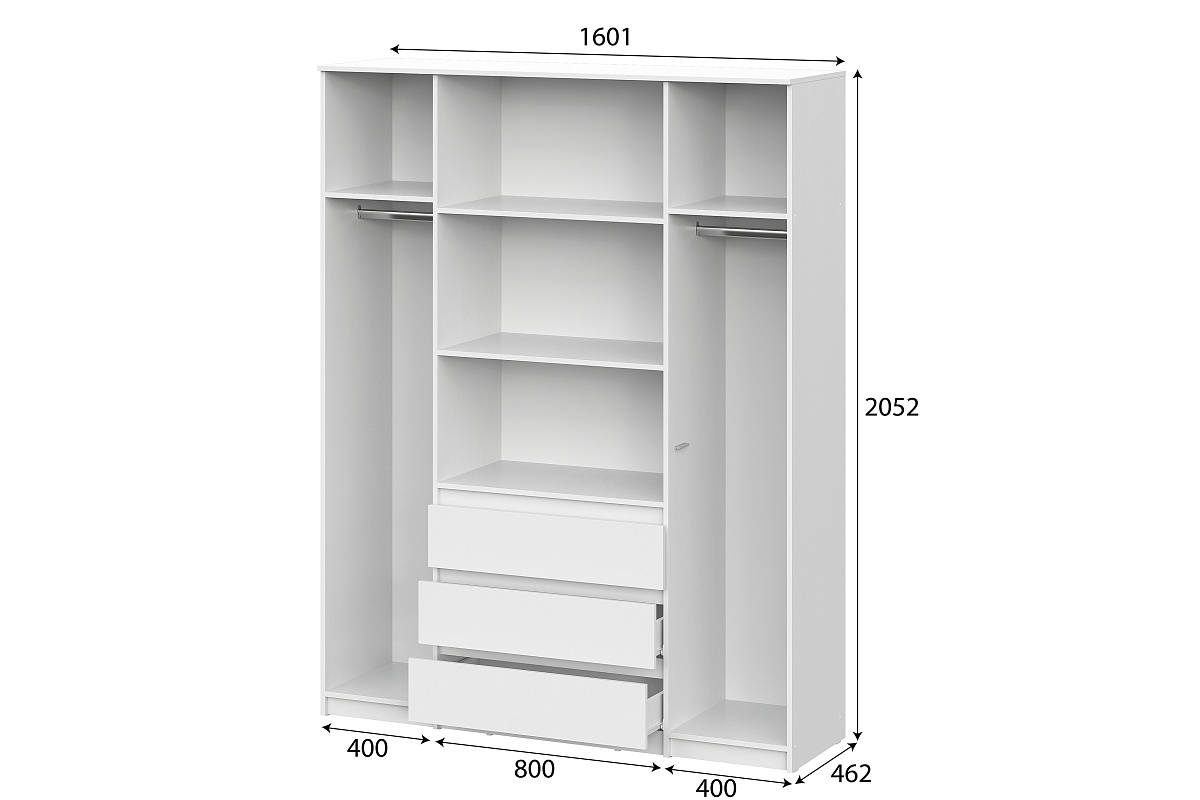 Шкаф оснащён четырьмя распашными створками, которые обеспечивают удобное хранение одежды и постельного белья. 3 выдвижных ящика, обеспечивают дополнительное место для хранения вещей. Шкаф «Денвер» — стильное и практичное решение для организации хранения вещей в спальне или прихожей.